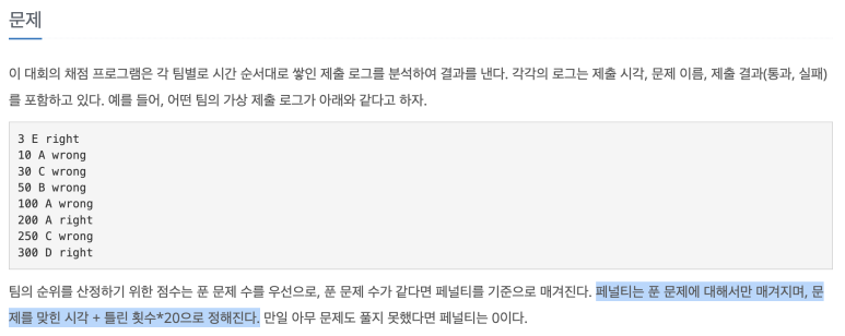 아래의 사진과 같이 패널티는 푼 문제에 대해서만 매겨지고 문제를 맞힌 시각 + 틀린 횟수 * 20이라는 공식을 사용하면 풀 수 있는 문제입니다.