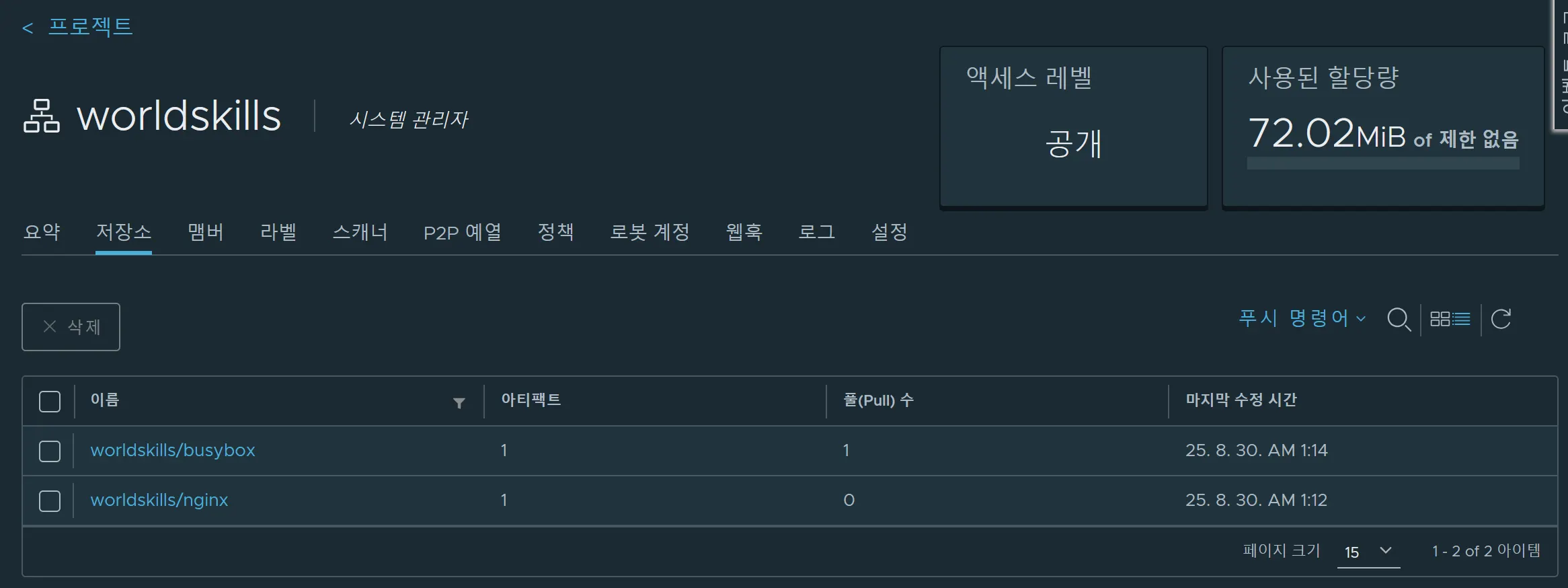 push 명령어 후 Harbor에 가서 확인해보면 아래의 사진과 같이 이미지가 업로드 된 모습을 확인 할 수 있습니다.