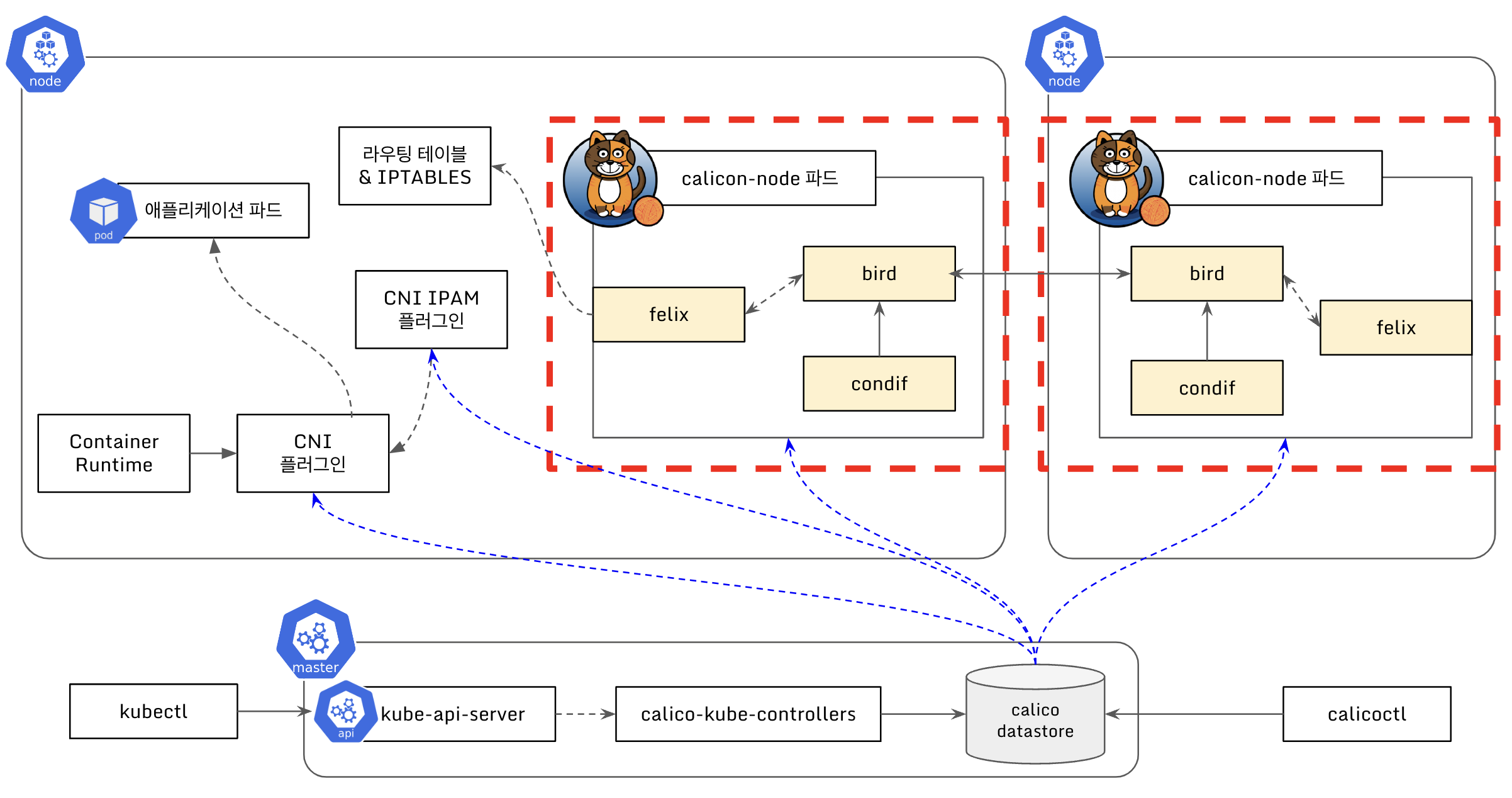파드 생성 시 Calico Datastore를 기반으로 CNI 및 IPAM 플러그인이 파드 네트워크를 설정하며, 노드 간 파드 통신은 bird가 학습한 경로 정보를 felix가 호스트의 라우팅 테이블과 iptables에 적용해 처리합니다.