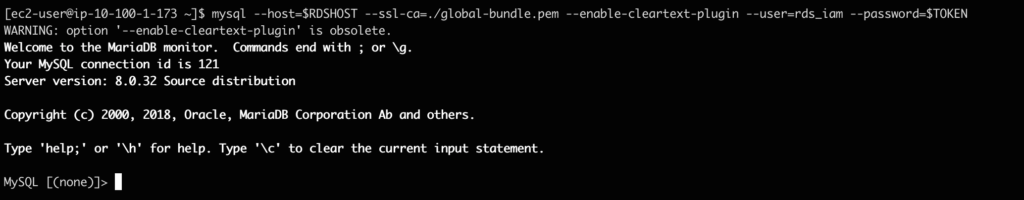 mysql --host=$RDSHOST --ssl-ca=./global-bundle.pem --enable-cleartext-plugin --user=rds_iam --password=$TOKEN