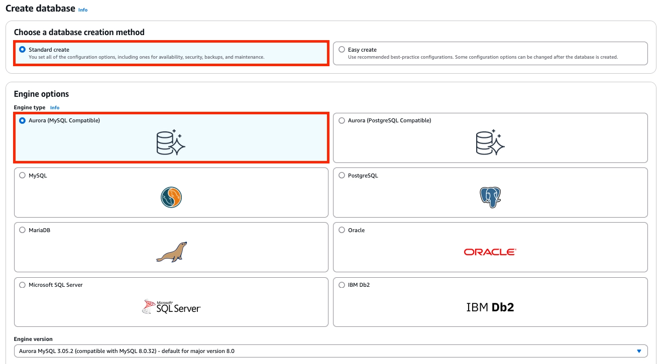 이제 RDS 생성 메뉴로 들어가 Standard create를 선택해주고 Aurora MySQL을 선택해주겠습니다.