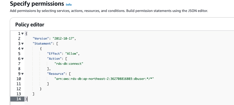 "arn:aws:rds-db:ap-northeast-2:<ACCOUNT_ID>:dbuser:*/*"
